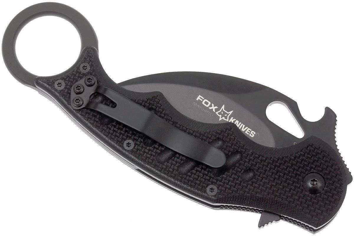 El Fox Mini Karambit es un karambit compacto y plegable. El mango G10, combinado con el anillo para los dedos, proporciona un agarre increíble. La hoja de acero N690Co se entrega muy afilada. Esto es muy conveniente, porque afilar una hoja con un amolado cóncavo es siempre complicado. Existen diferentes opciones para abrir este cuchillo. Puedes utilizar el orificio para el pulgar, el flipper o la onda Emerson. Este es el gancho en la parte posterior de la hoja. Puedes engancharlo a tu bolsillo y así el cuchillo se abrirá automáticamente cuando lo saques del bolsillo.