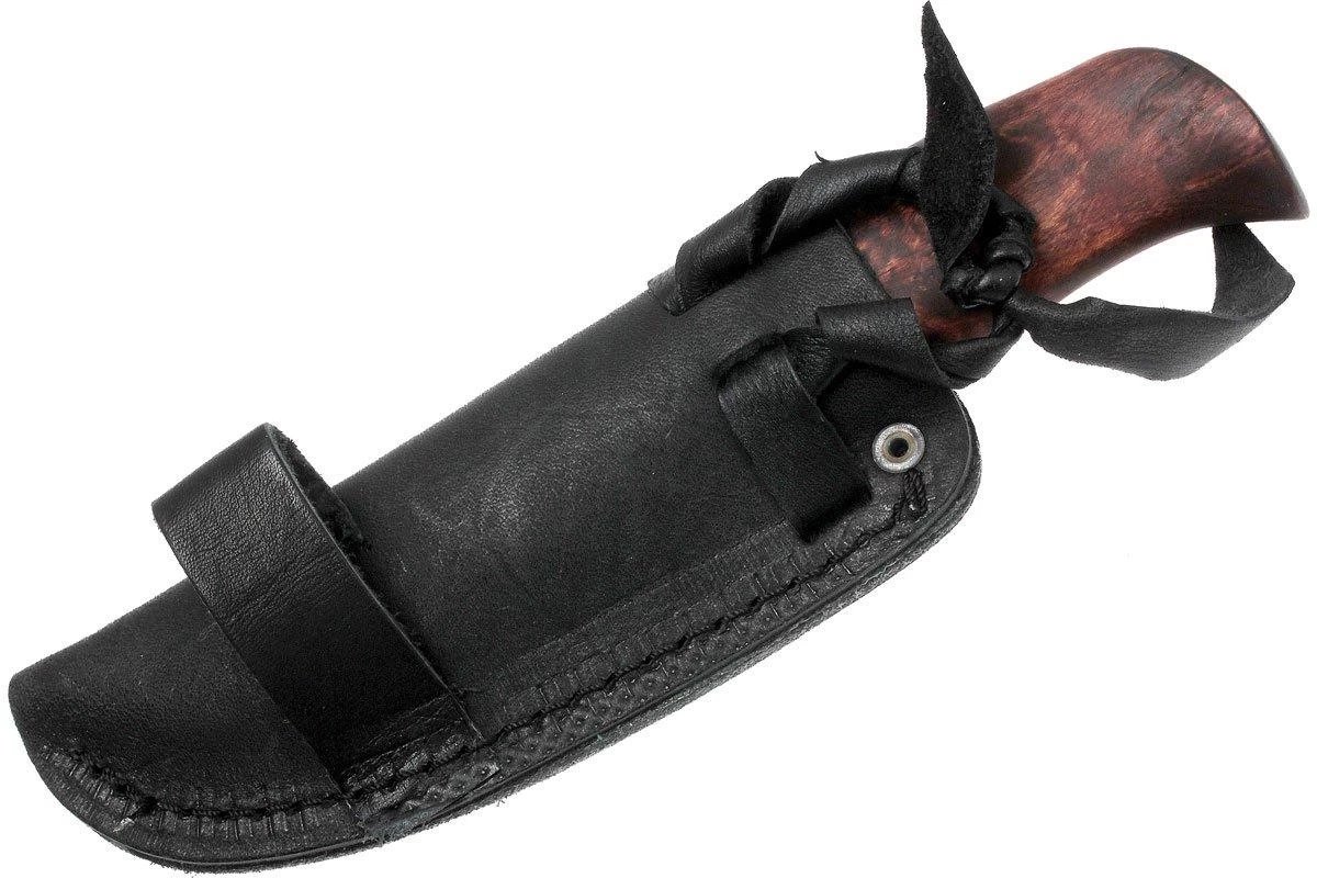 El Karesuando Vuonjal es un típico cuchillo escandinavo de exterior. El mango de madera de abedul rizado se frota con aceite para que soporte mejor los elementos. Han añadido un anillo o cuerno de reno que queda realmente bonito. La forma ergonómica del mango hace que este cuchillo sea realmente cómodo de usar. La hoja de acero 12c27-Sandvik tiene un afilado scandi, una forma típica escandinava de afilar que hace que el filo sea muy fuerte y fácil de afilar. La hoja y el mango están separados por un precioso cabezal de latón.
