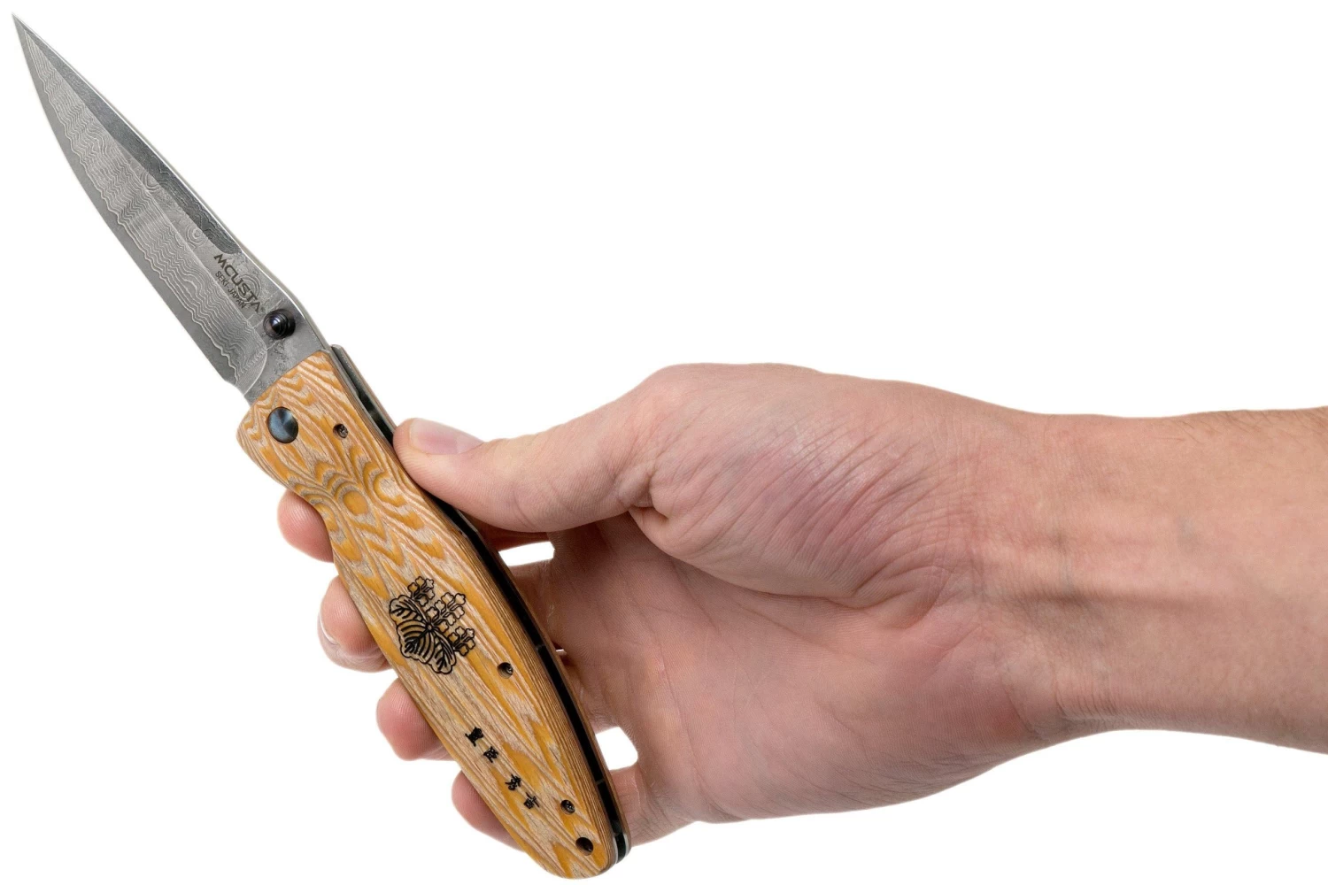 La Mcusta MC-0182D Sengoku Toyotomi Hideyoshi es una extraordinaria navaja japonesa, con impresionantes detalles. La hoja está compuesta por un núcleo de acero VG10, revestido de acero de Damasco niquelado. Como es de esperar de los fabricantes japoneses, el filo es muy afilado. El mango es especialmente bonito. La madera está tallada en 3D para un agarre de aspecto agradable, y esto es funcional también, ofreciendo una mejor tracción.