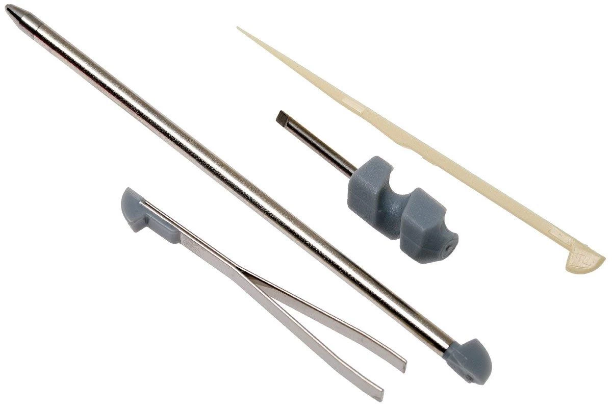 | Herramientas | lezna, abridor de botellas, sacacorchos, gancho multiusos, llavero, cuchillo, sierra, tijeras, destornillador pequeño, abrelatas, palillo de dientes, pinzas, pelacables, destornillador de estrella, bolígrafo, lámpara led |